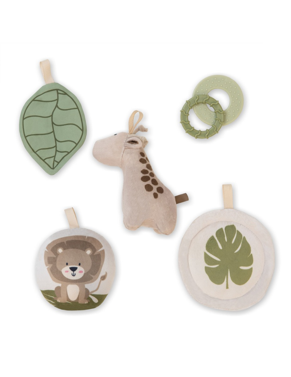 Setul include o varietate de jucarii care dezvolta abilitatile bebelusului: o oglinda, o frunza din material fosnitor, o jucarie rotunda in forma de leu care scartaie, o jucarie de plus in forma de girafa cu zornaitoare si jucarii de dentitie.