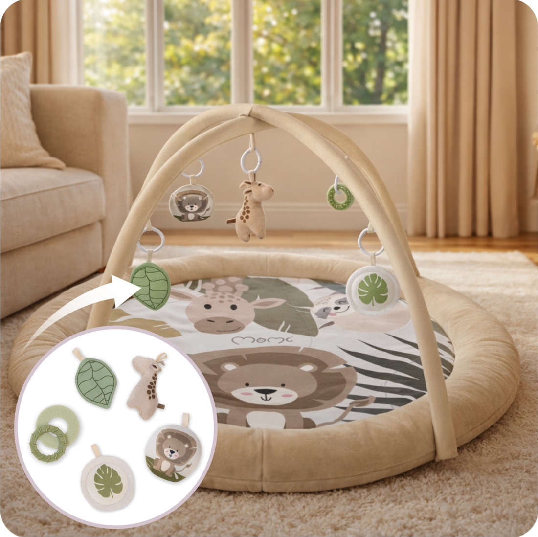 MoMi LUANI este o saltea de activitati clasica, fabricata din materiale moi si plusate, delicate cu pielea delicata a bebelusului. Setul include patru jucarii senzoriale care imbunatatesc timpul activ al micutului tau si ii sustin dezvoltarea, precum si doua jucarii de dentitie.